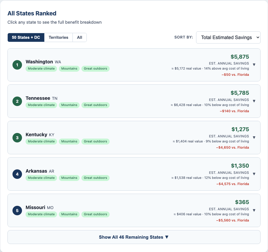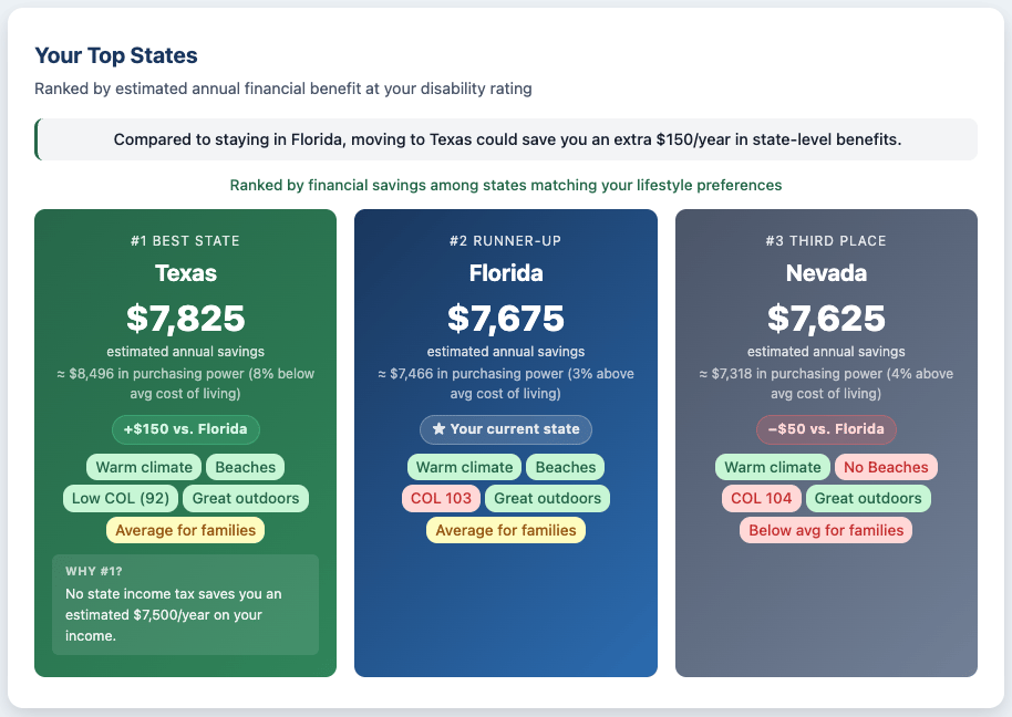I just launched the Best State for Veterans tool - it ranks all 50 states, DC, and U.S. territories by estimated annual financial benefit, personalized to your specific situation.