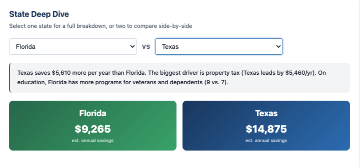 For that same 100% P&T veteran comparing Texas vs. Florida, the summary reads something like: "Texas saves $3,200 more per year than Florida. The biggest driver is property tax — Texas leads by $3,200/yr on a $350K home. On education, Texas has significantly more programs for veterans and dependents (9 vs. 3) thanks to the Hazelwood Act."