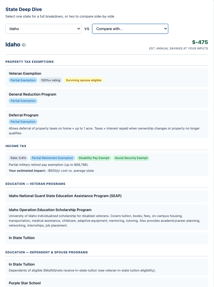 This one took longer to build than anything else I've done. The data alone - 50 states, property tax exemption tiers by rating, income tax treatment of military retirement, education programs, vehicle exemptions - is a research project by itself. I've been collecting it for weeks.